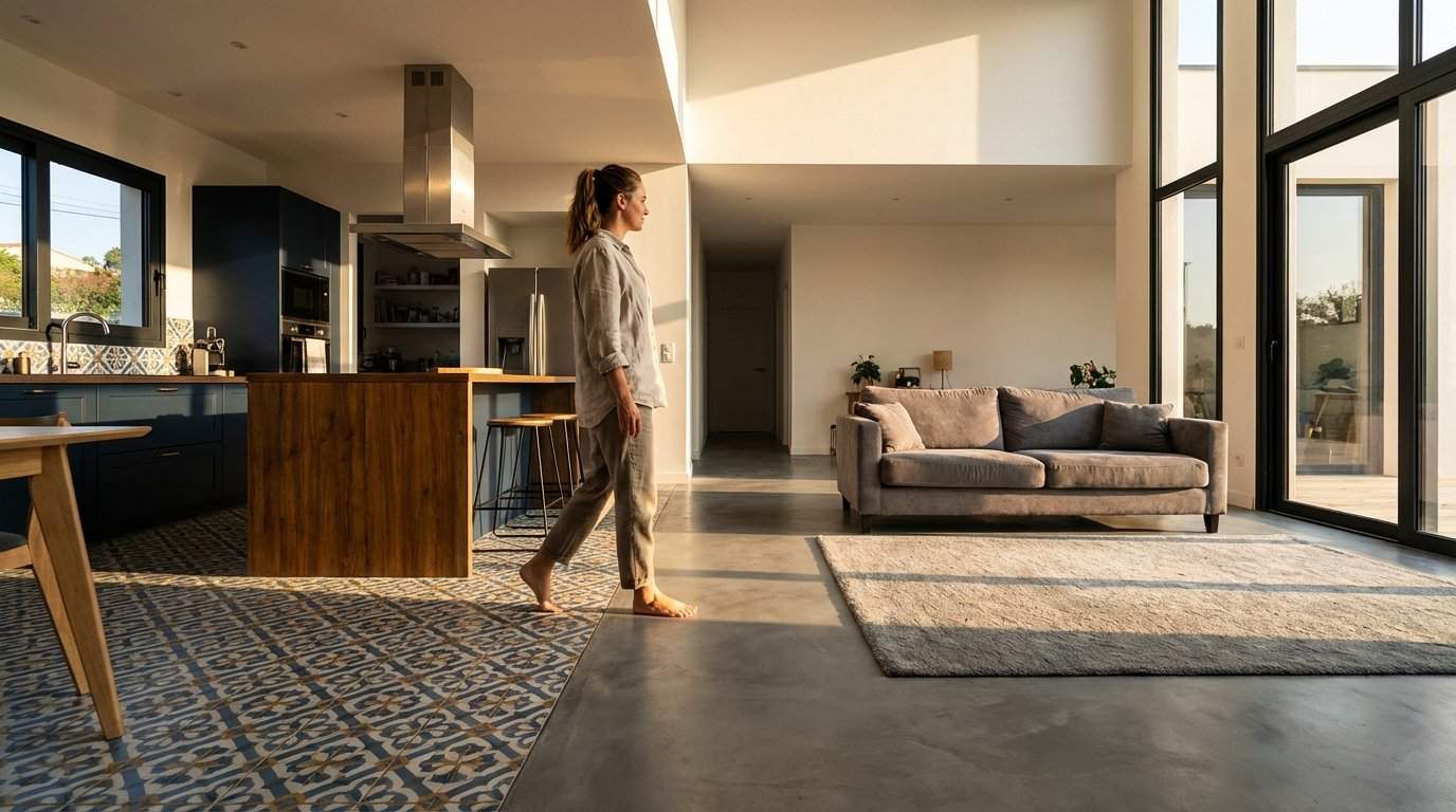 Komfort użytkowania to kategoria, w której podłoga z mikrocementu deklasuje tradycyjną ceramikę. Ze względu na zawartość polimerów i specyficzną strukturę, mikrocement przyjmuje temperaturę otoczenia, dzięki czemu jest przyjemny w dotyku nawet bez ogrzewania podłogowego. Chodzenie boso po takiej nawierzchni przypomina kontakt z naturalnym drewnem, a nie zimnym kamieniem.